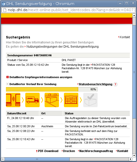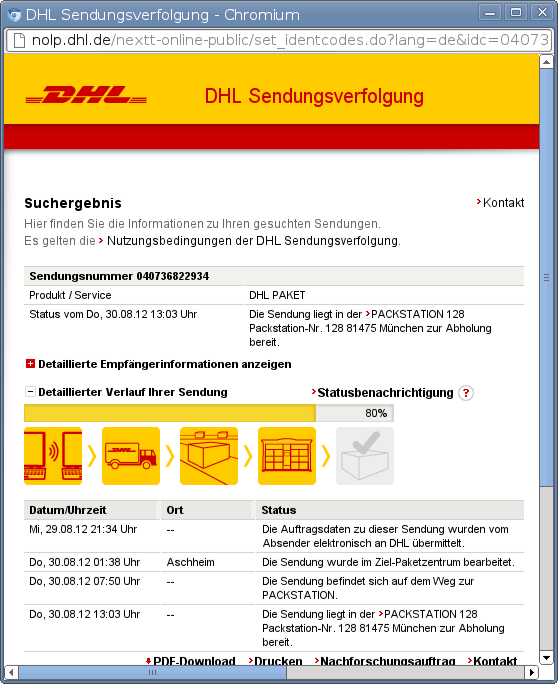 Donnerstag, 30. August 2012: DHL meldet auch für das zweite Paket: „Diese Sendung befindet sich auf dem Weg zur Packstation“ und es tut sich weiter nichts.