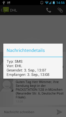 Mit einer SMS am 3. September um 8:26 Uhr hat mich die Packstation informiert, dass die Sendung bereit ist.